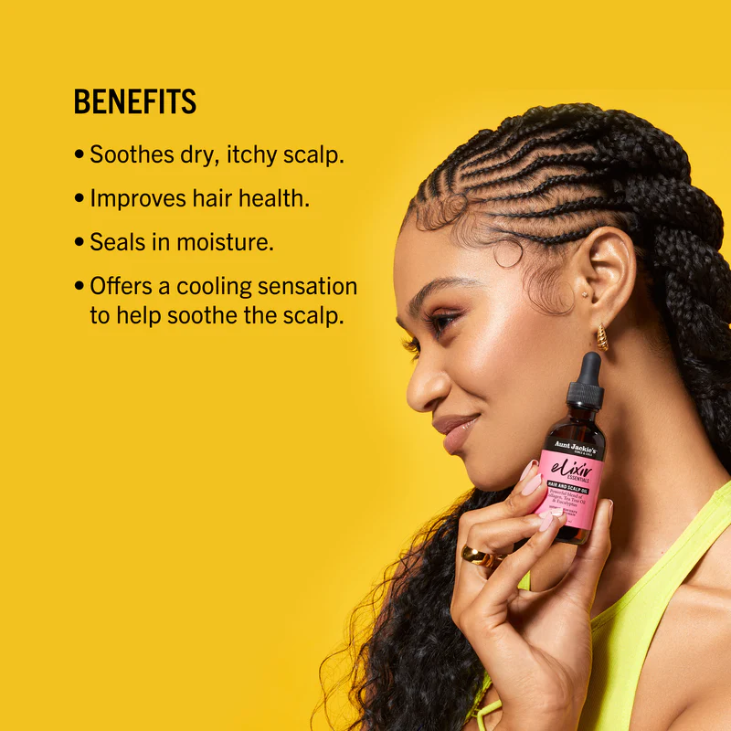 Aunt Jackie’s Curls & Coils Elixir Essentials is a Hair & Scalp Oil infused with premium natural oils to address your top hair challenges. Formulated with special ingredients such as Collagen, Tea Tree Oil & Eucalyptus to hydrate dry scalp, relieve an itchy scalp, and seal in moisture to improve hair and scalp health. This lightweight oil offers a cooling sensation to help soothe the scalp and provides the essential care elements you desire to achieve healthy hair.
